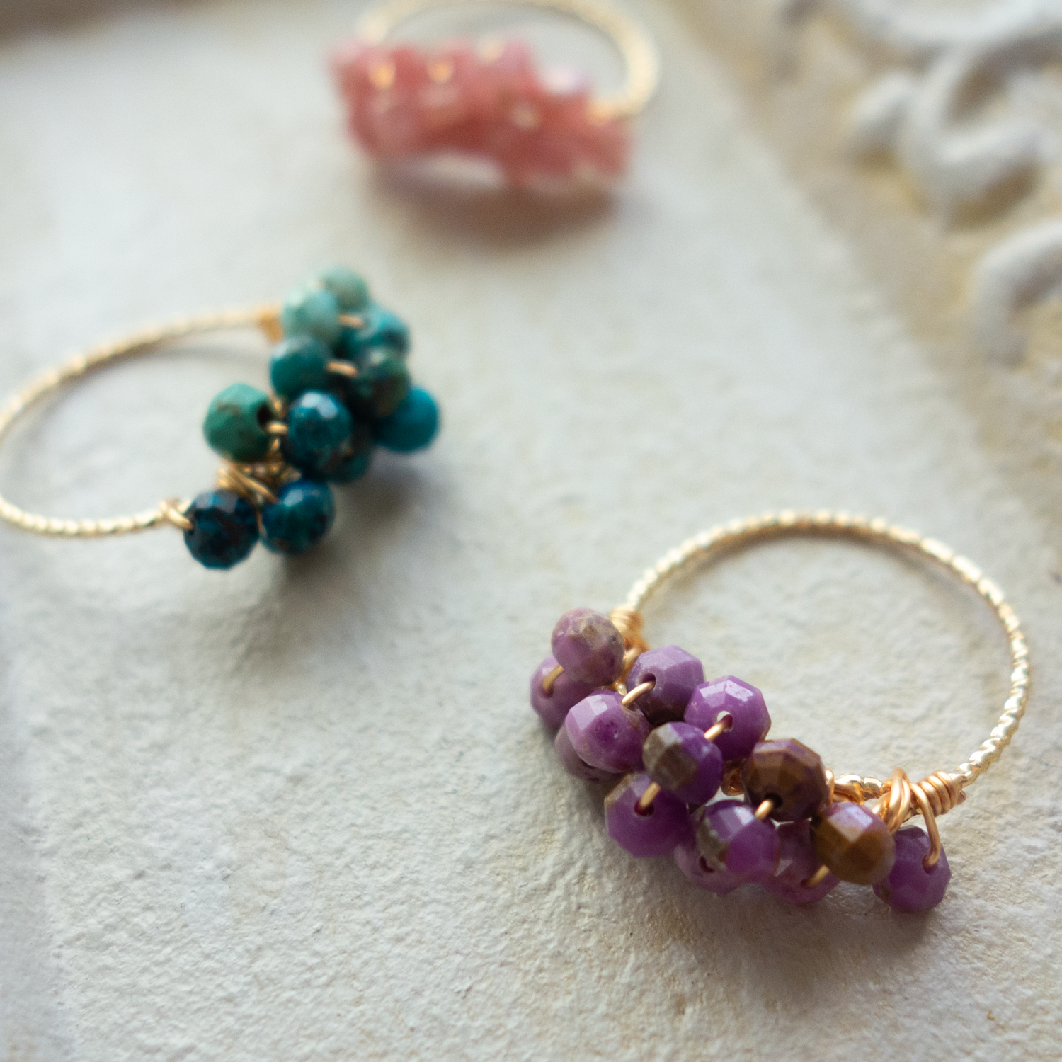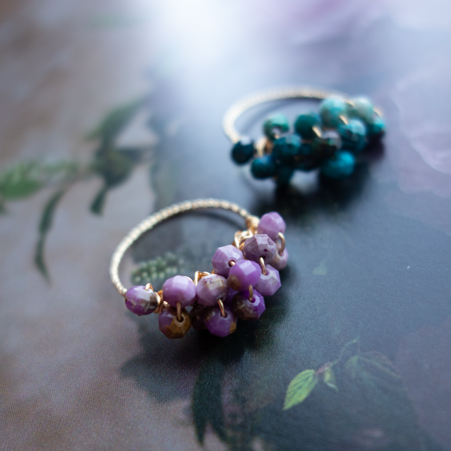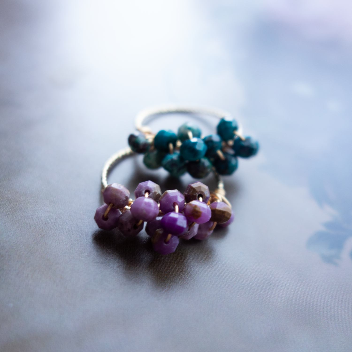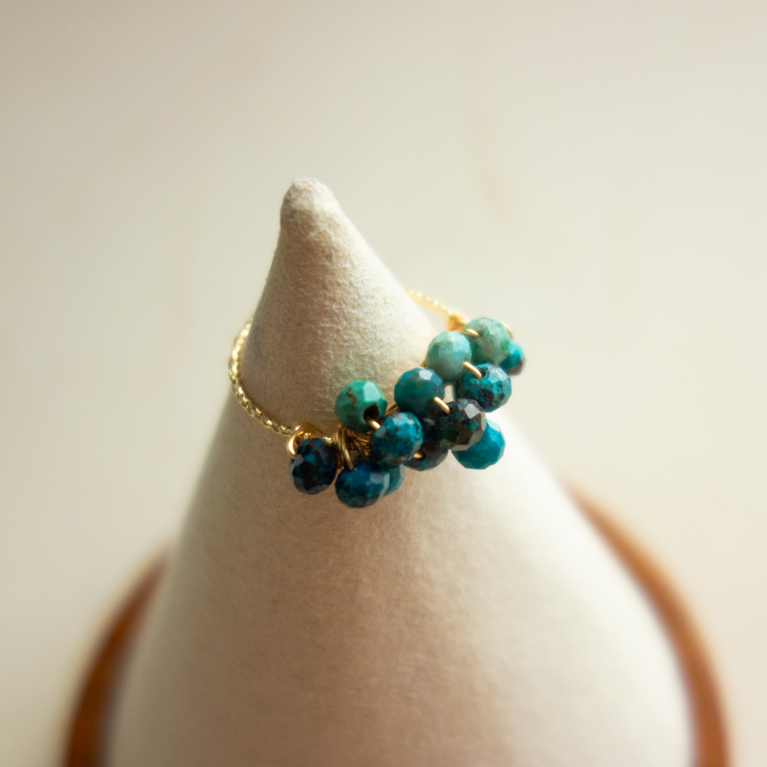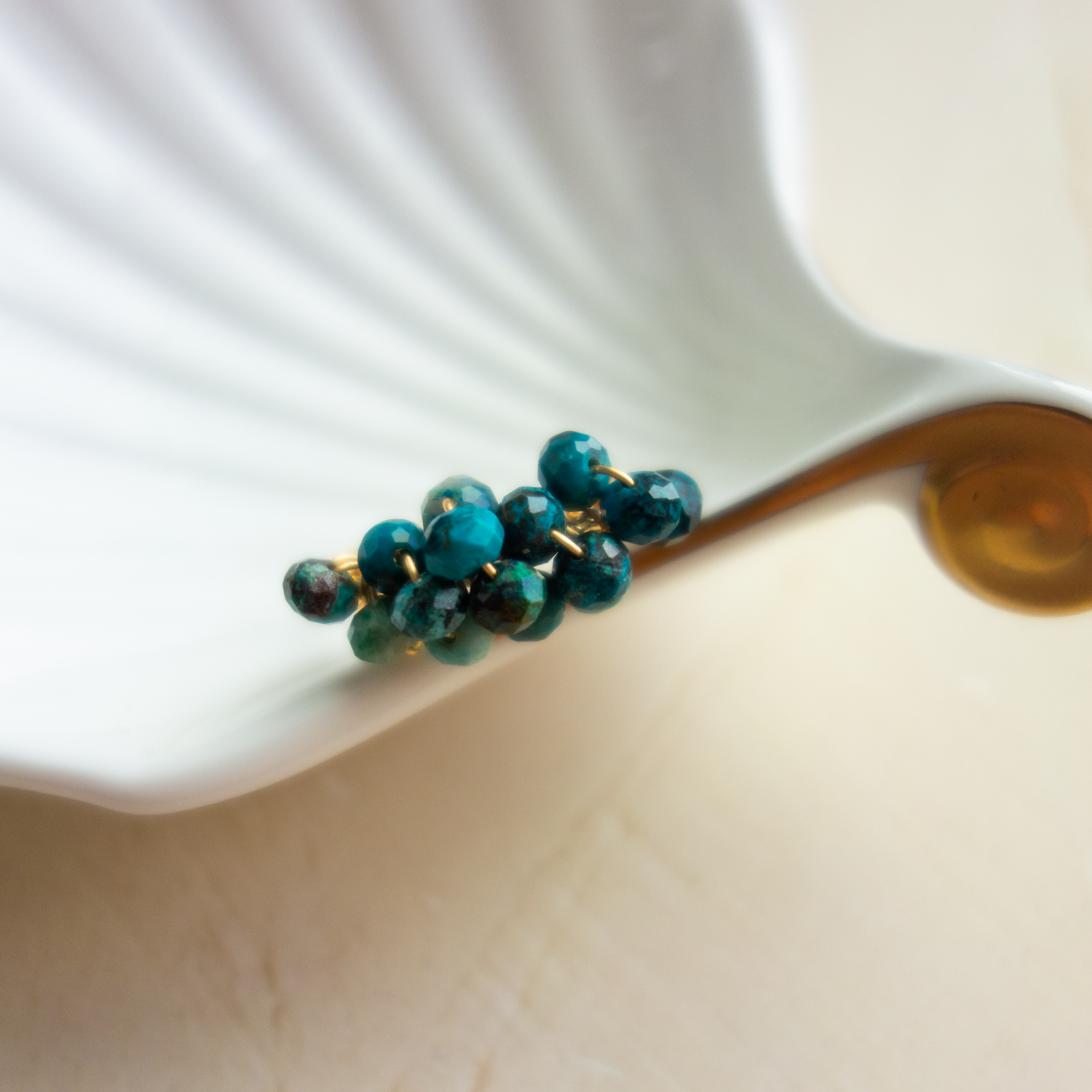 カッティングの入った3mmのストーンを、14Kゴールドフィルドのワイヤーに散りばめています。クリソコラ、フォスフォシデライト、は、どのストーンも一粒一粒の色彩や濃淡の違いがとても個性的で、たくさん集まることにより一層の存在感を発揮します。
