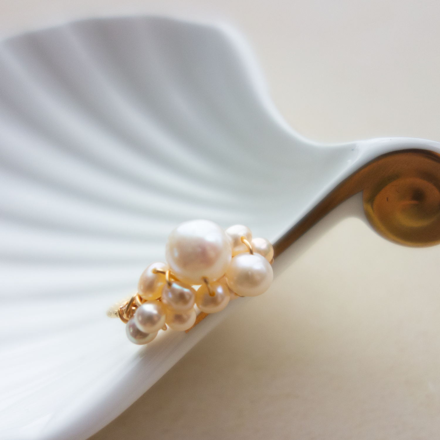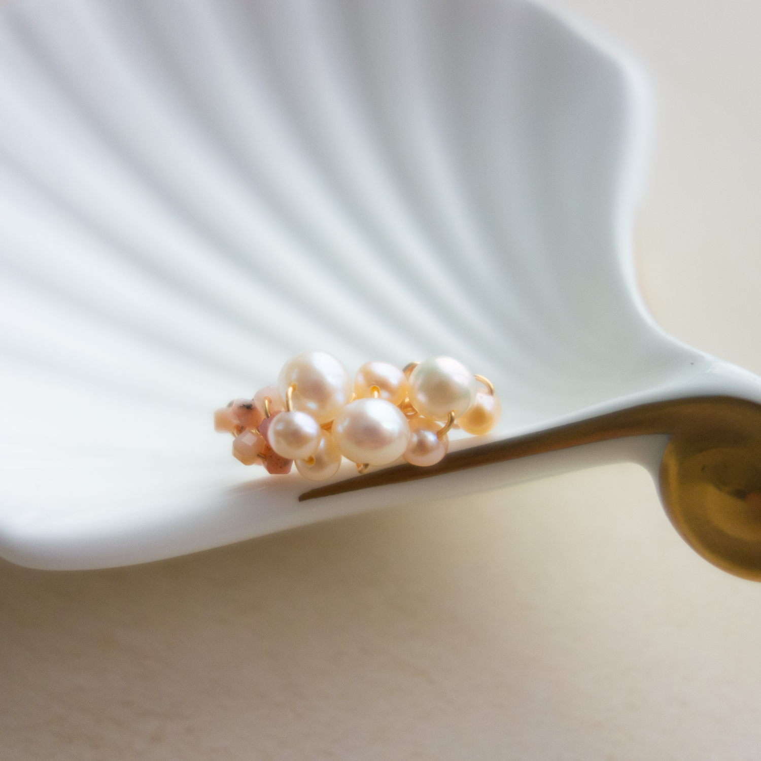 一番小粒のパールは、少しピンクがかった色合いで、アレンジ全体に優しいトーンをプラスしています。