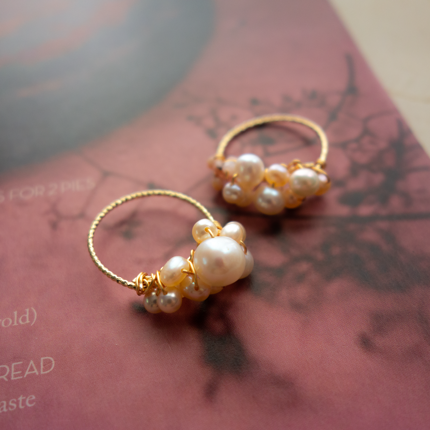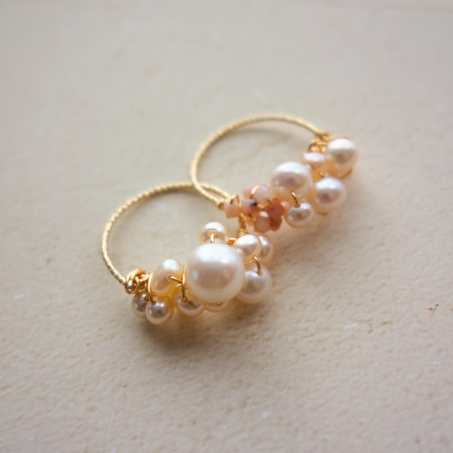 淡水パールを、14Kゴールドフィルドのワイヤーに散りばめています。少しずつ大きさや形が異なるパールをボリューム感が出るようにワイヤーで巻き込んだデザインです。