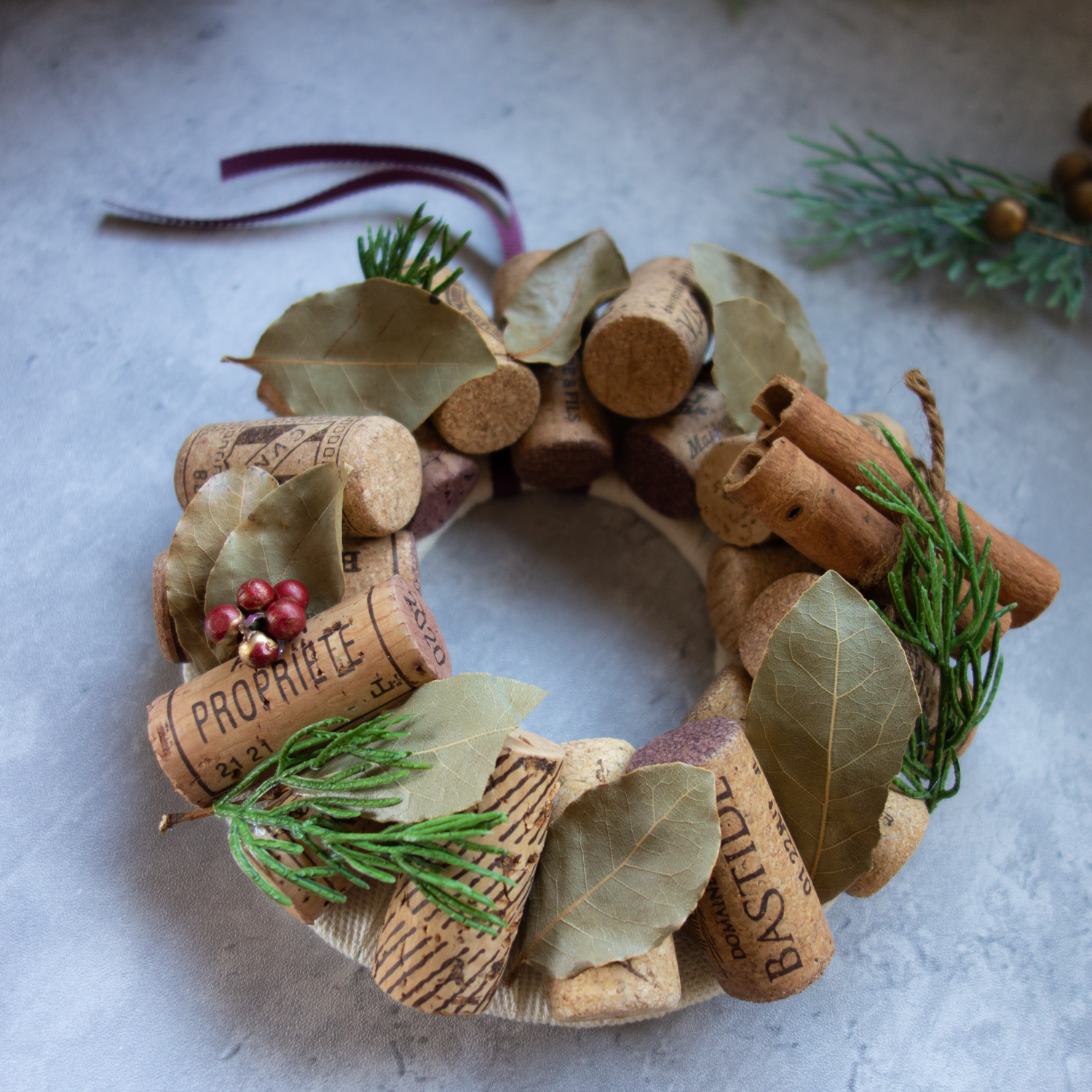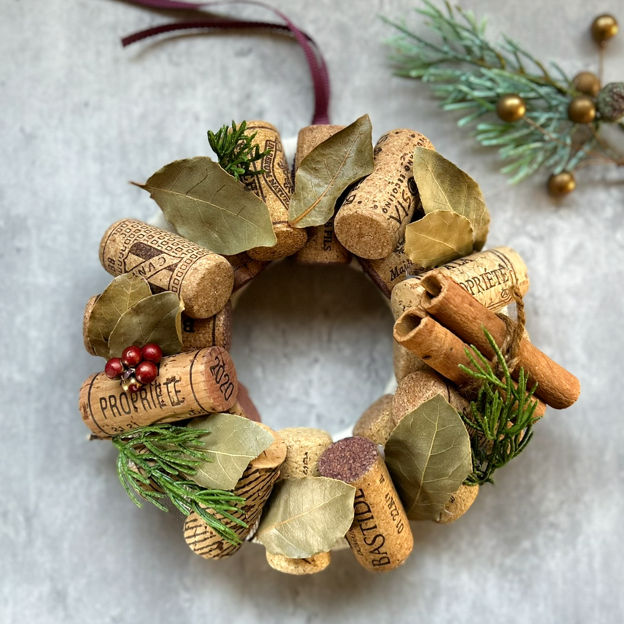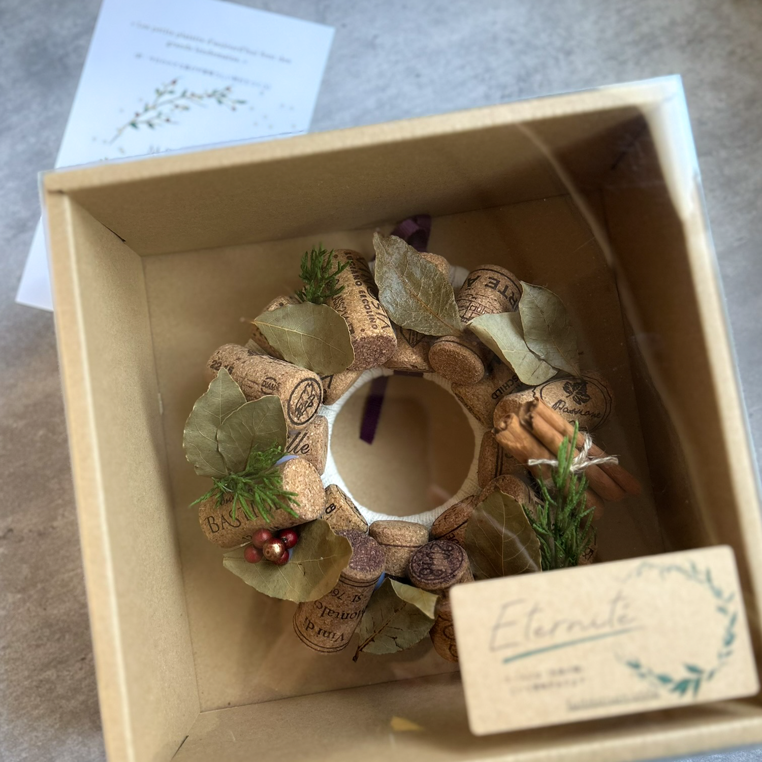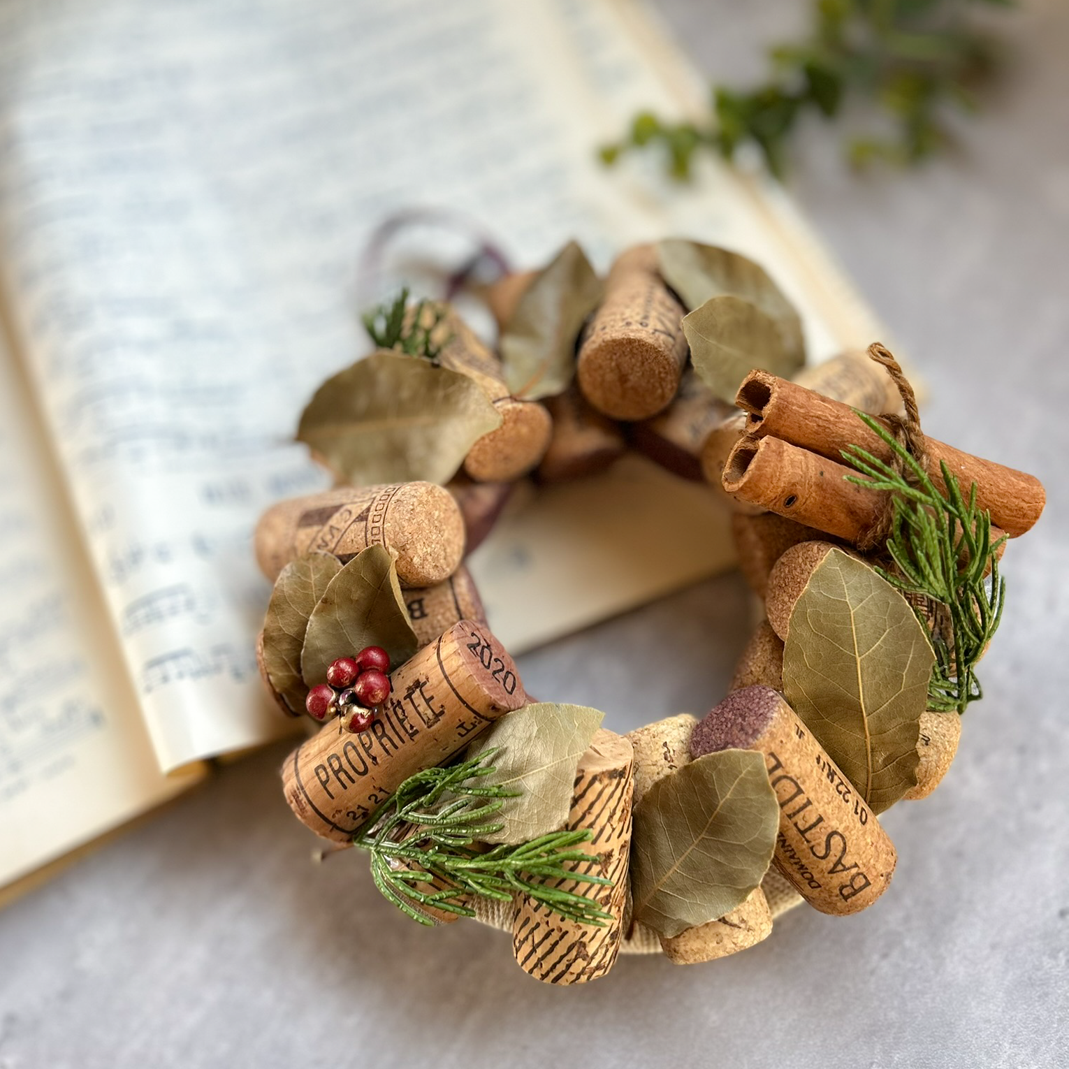 ワインコルク(天然)、シナモンスティック、ドライローレル(天然)、アートフラワー等