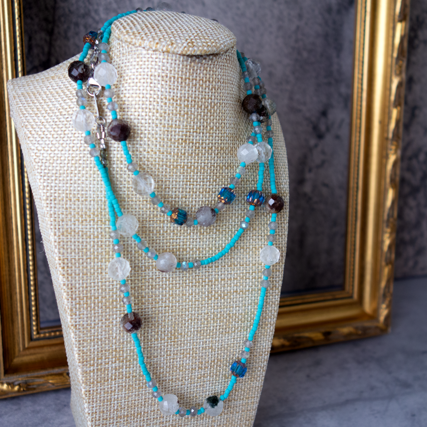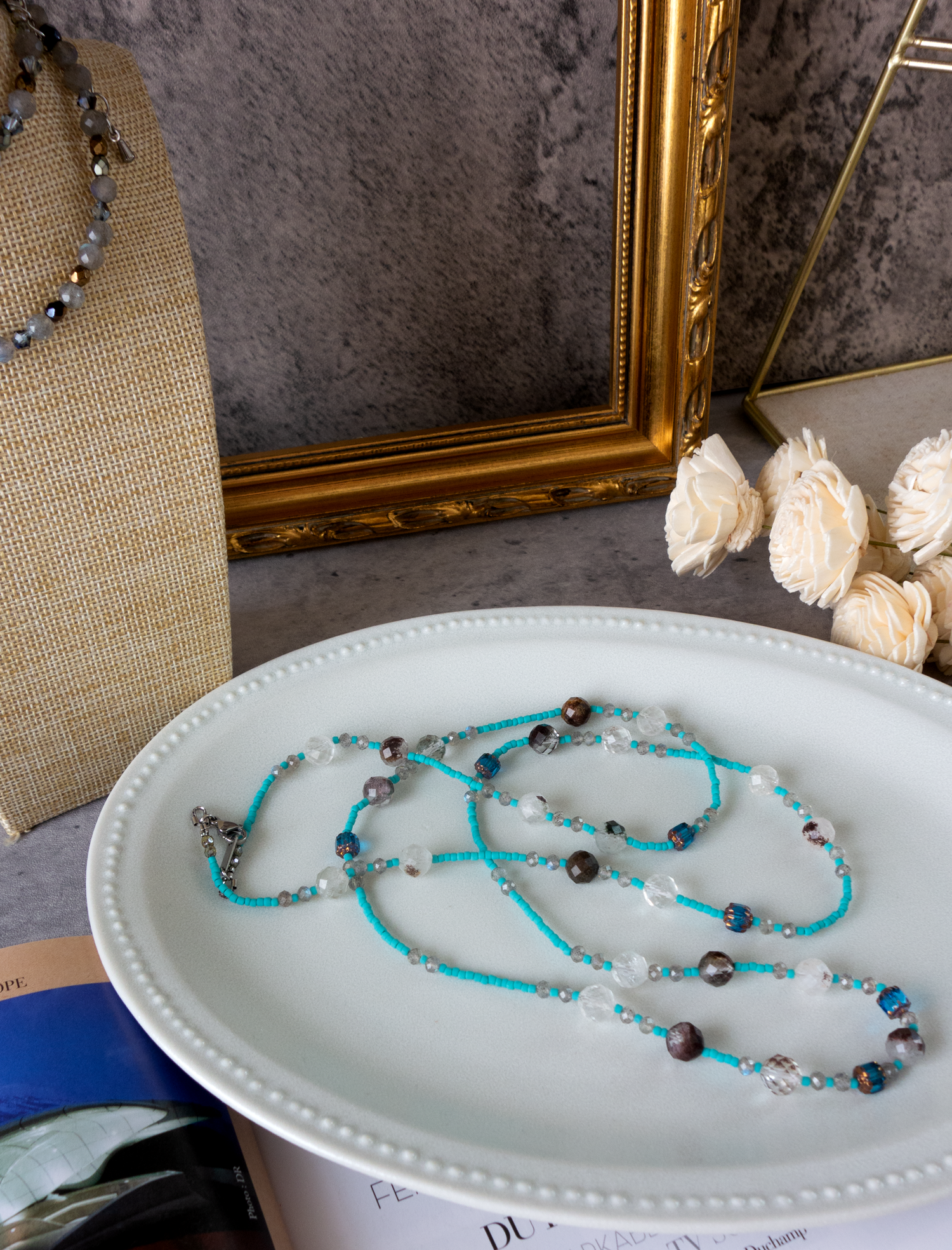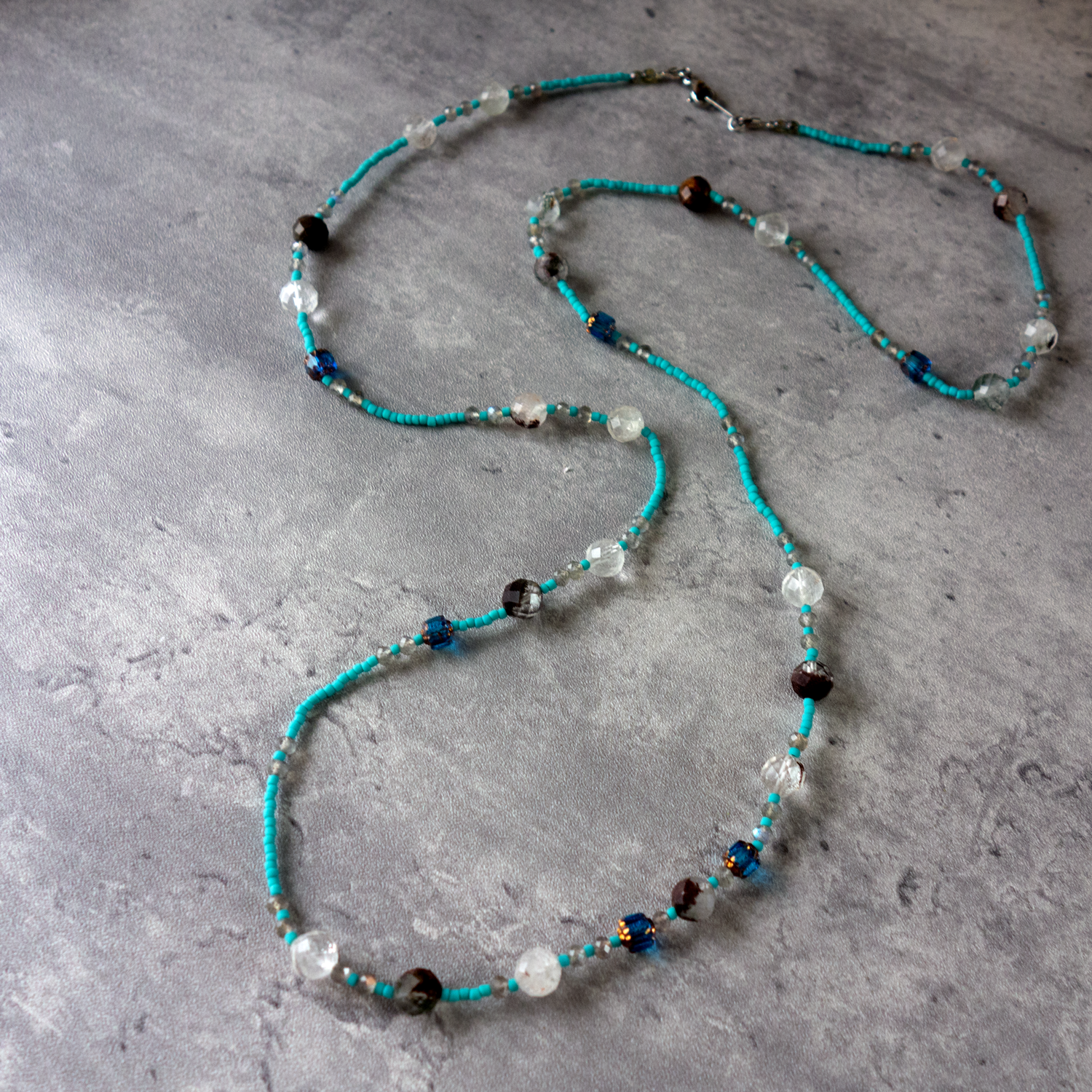 A 90cm long necklace made of beautiful matte blue seed beads and garden quartz. The matte colored glass beads like ceramic and the shine of the cut quartz create a contrasting nuance.