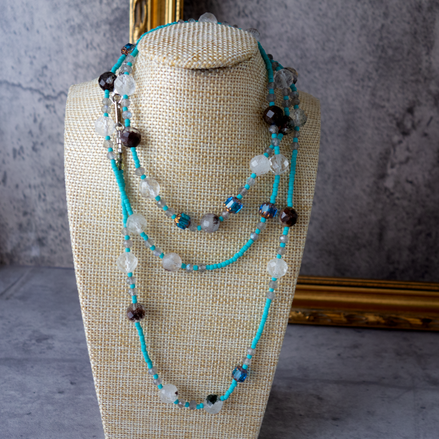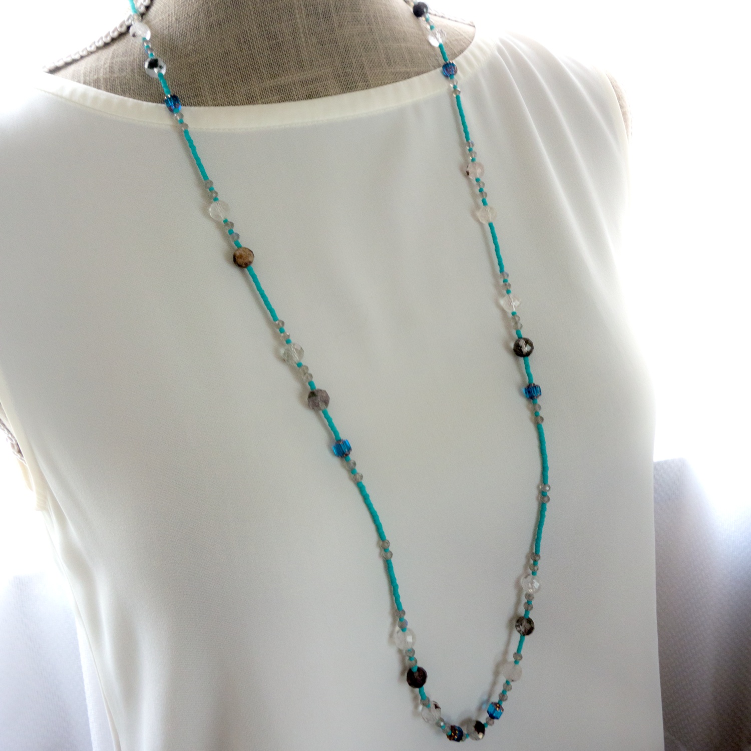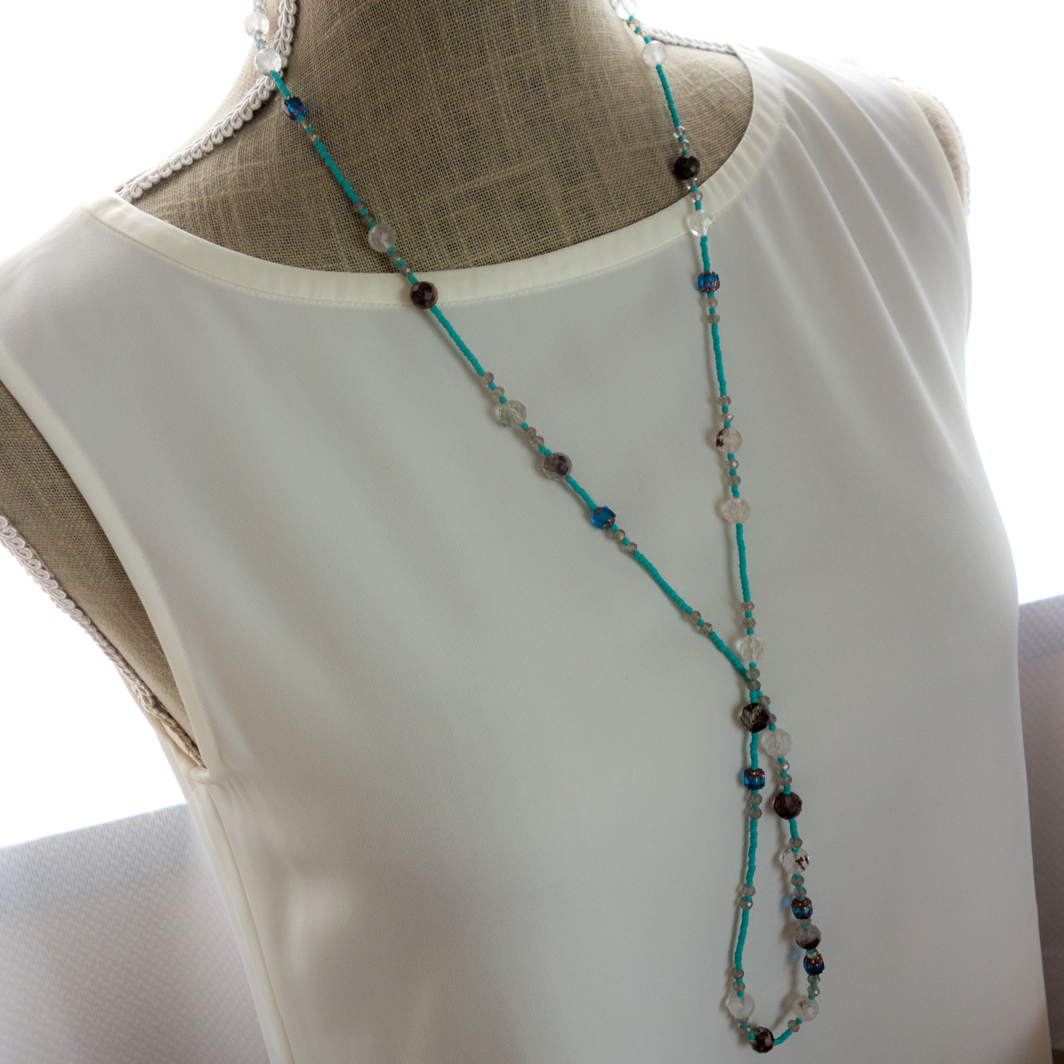 A 90cm long necklace made of beautiful matte blue seed beads and garden quartz. The matte colored glass beads like ceramic and the shine of the cut quartz create a contrasting nuance.