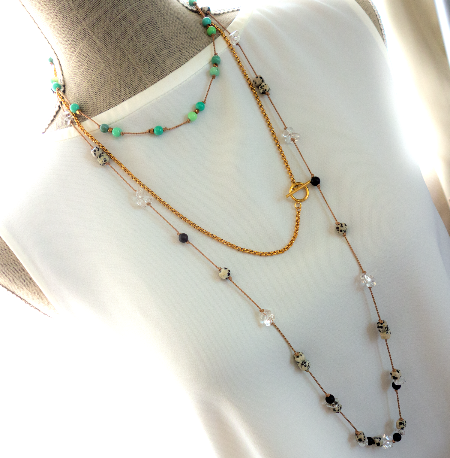 with a black and white speckled pattern, matte jasper, and black onyx.