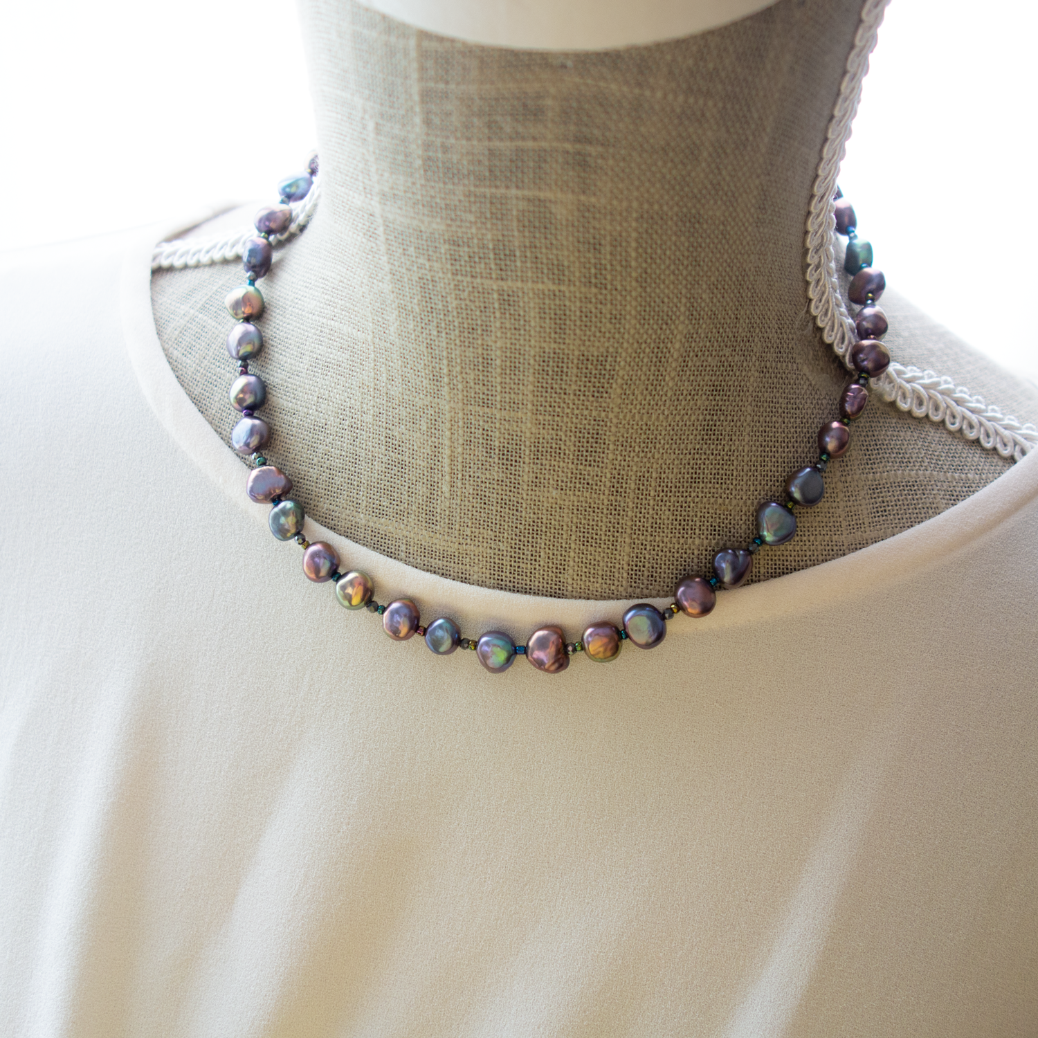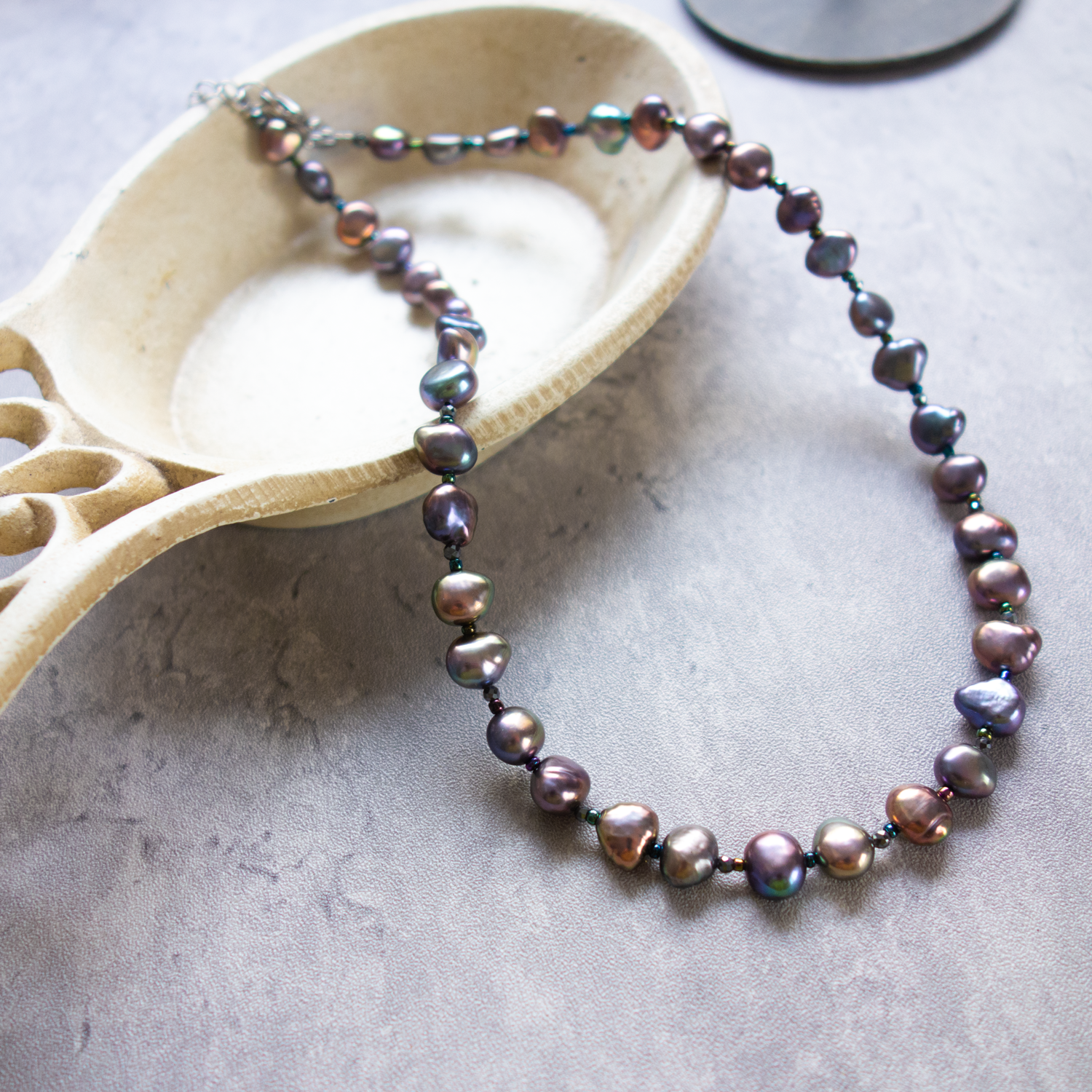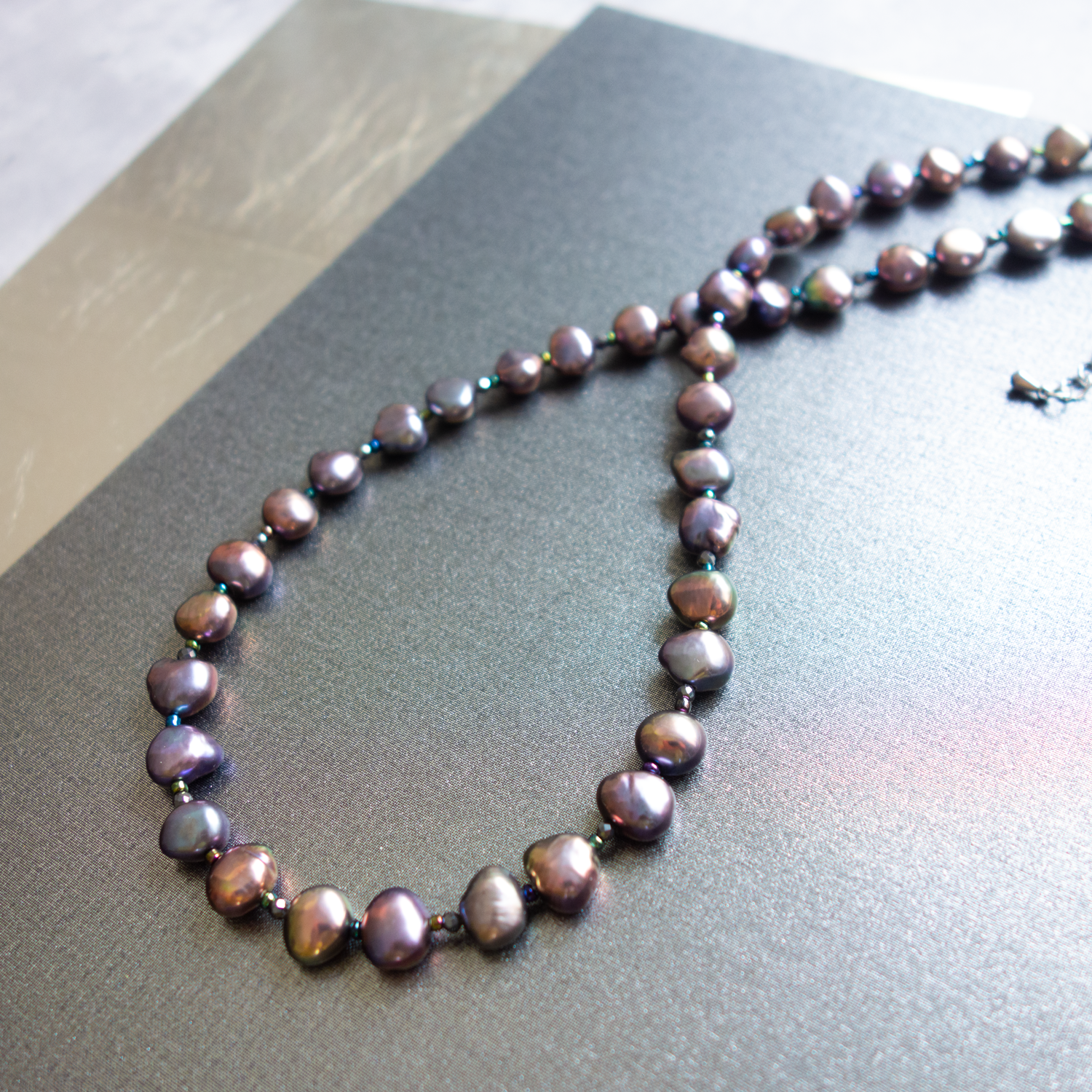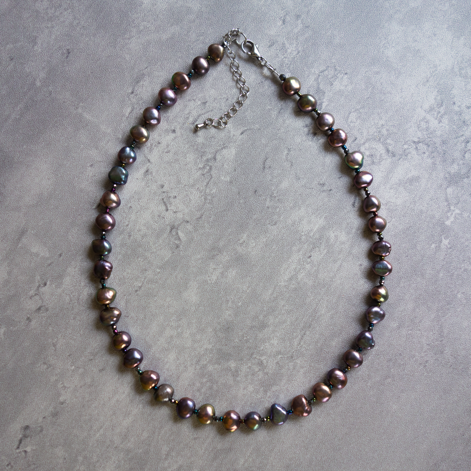 パールとパールの間に、極小のビーズ(玉虫色)と