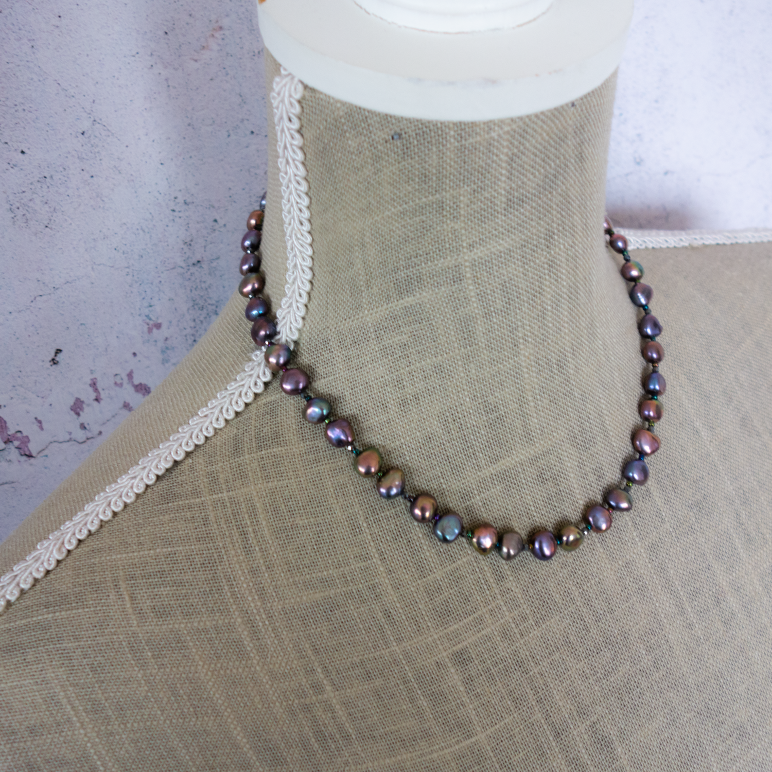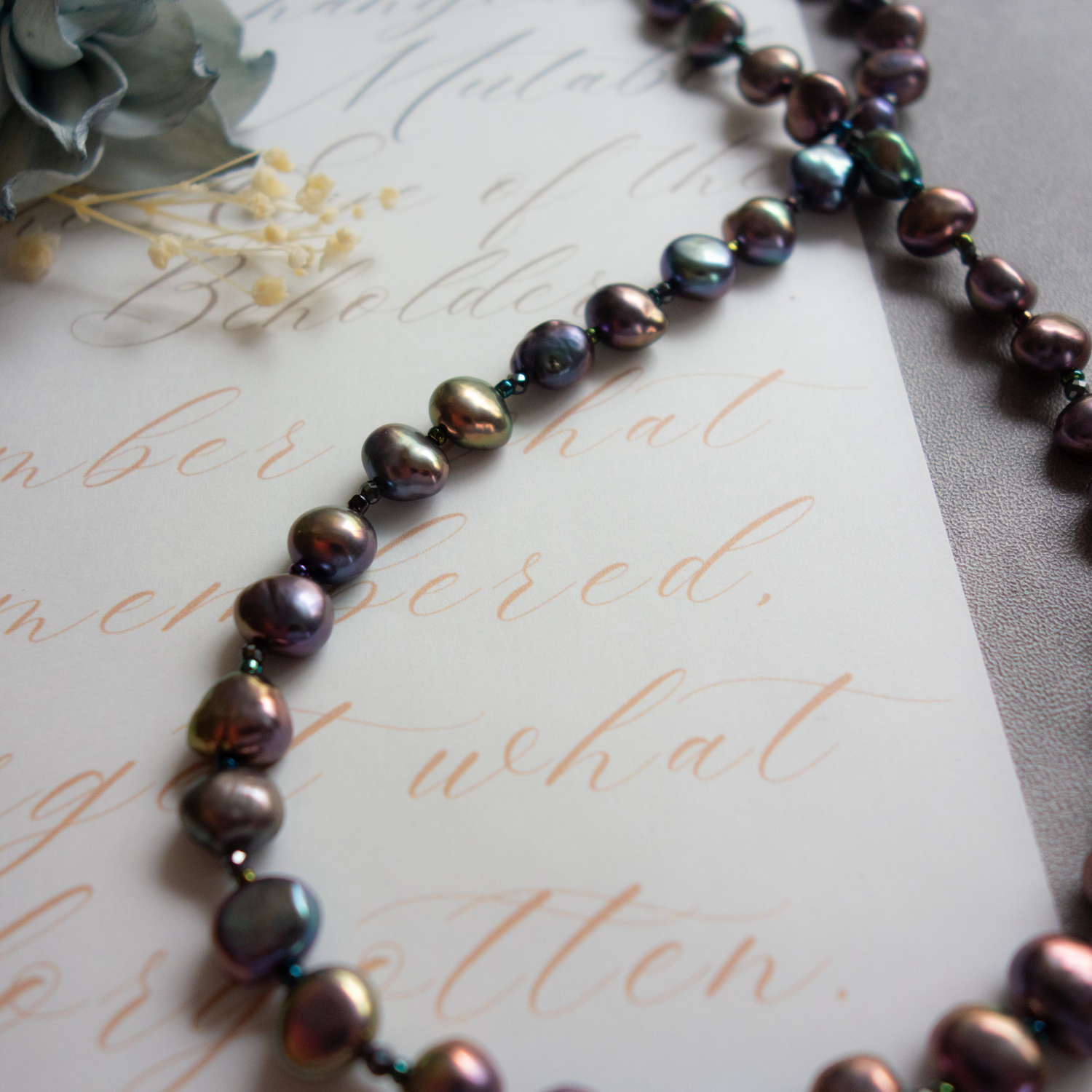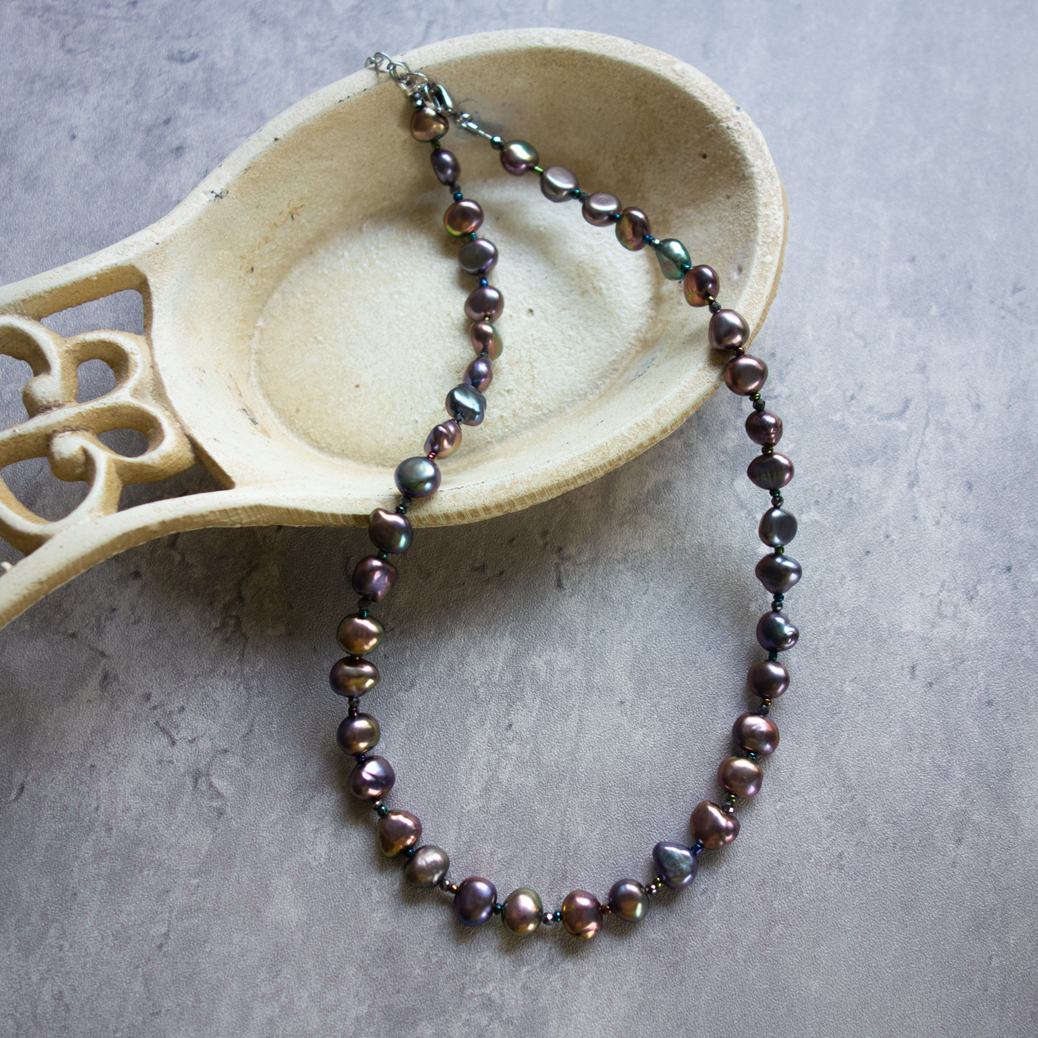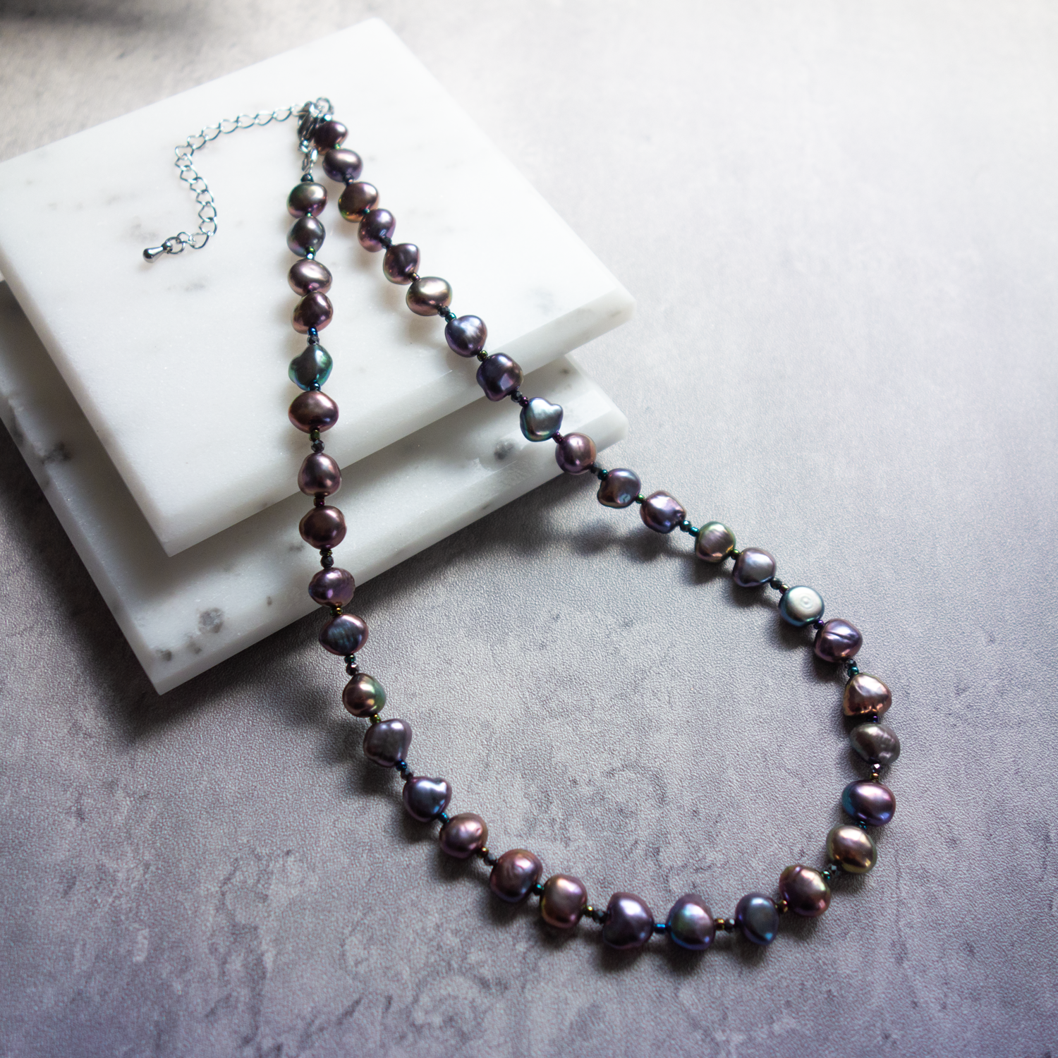 パールとパールの間に、極小のビーズ(玉虫色)と