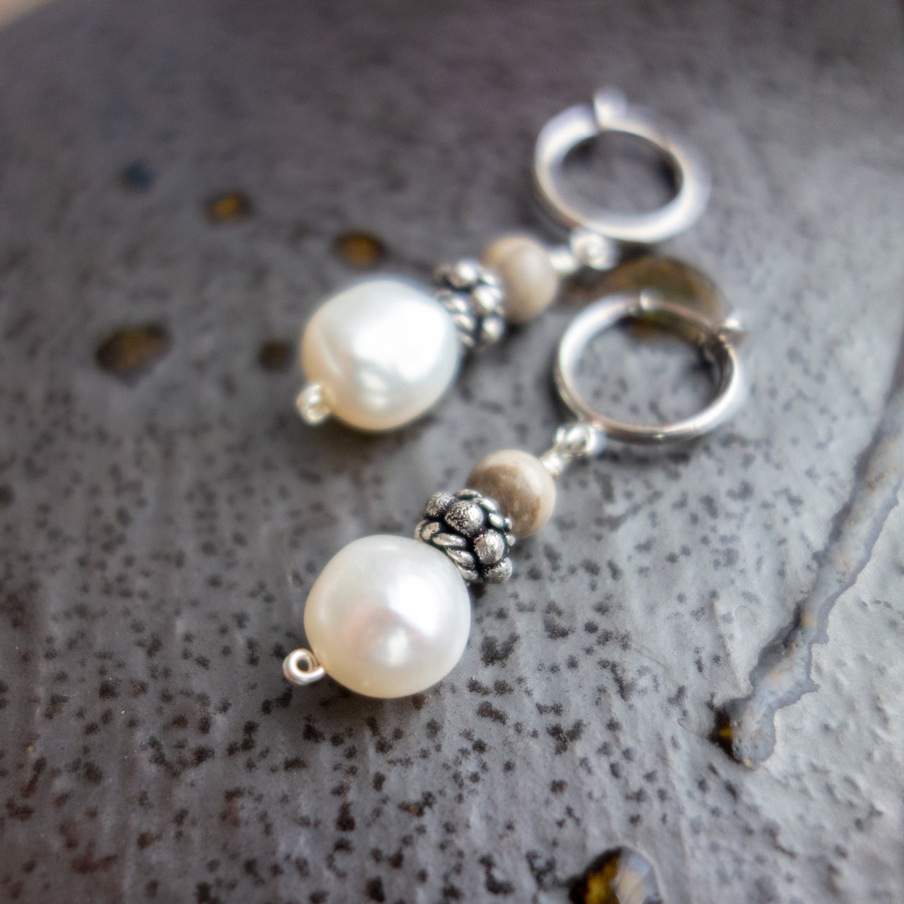 大粒の淡水パール+シックな色合いのシルバーリーフジャスパー.
