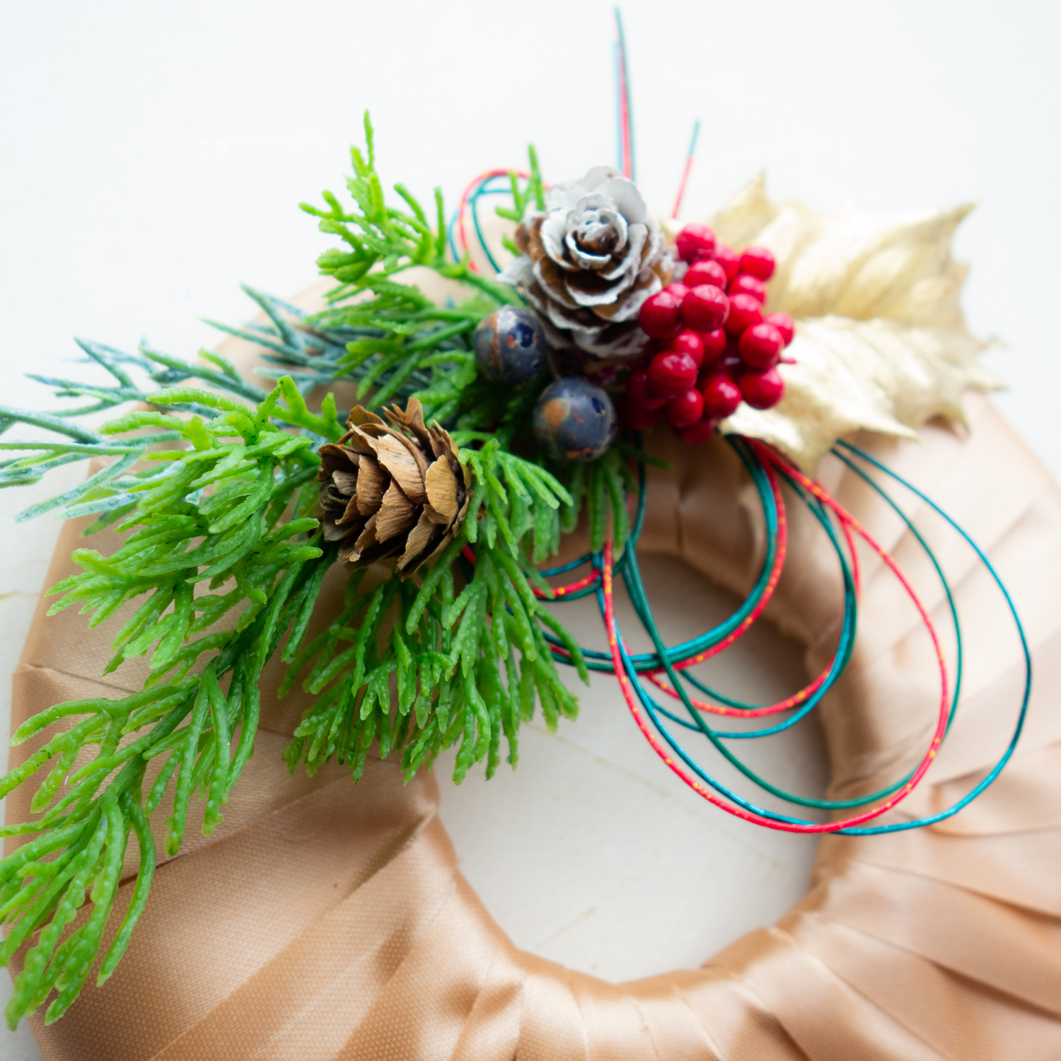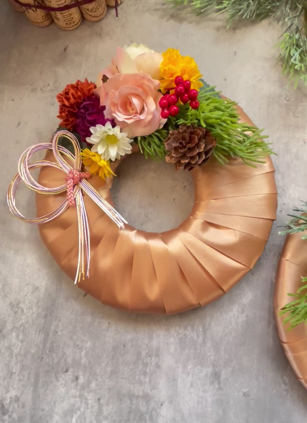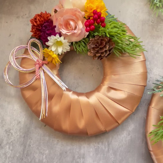 光沢のあるサテンリボンを巻いたリース台に
