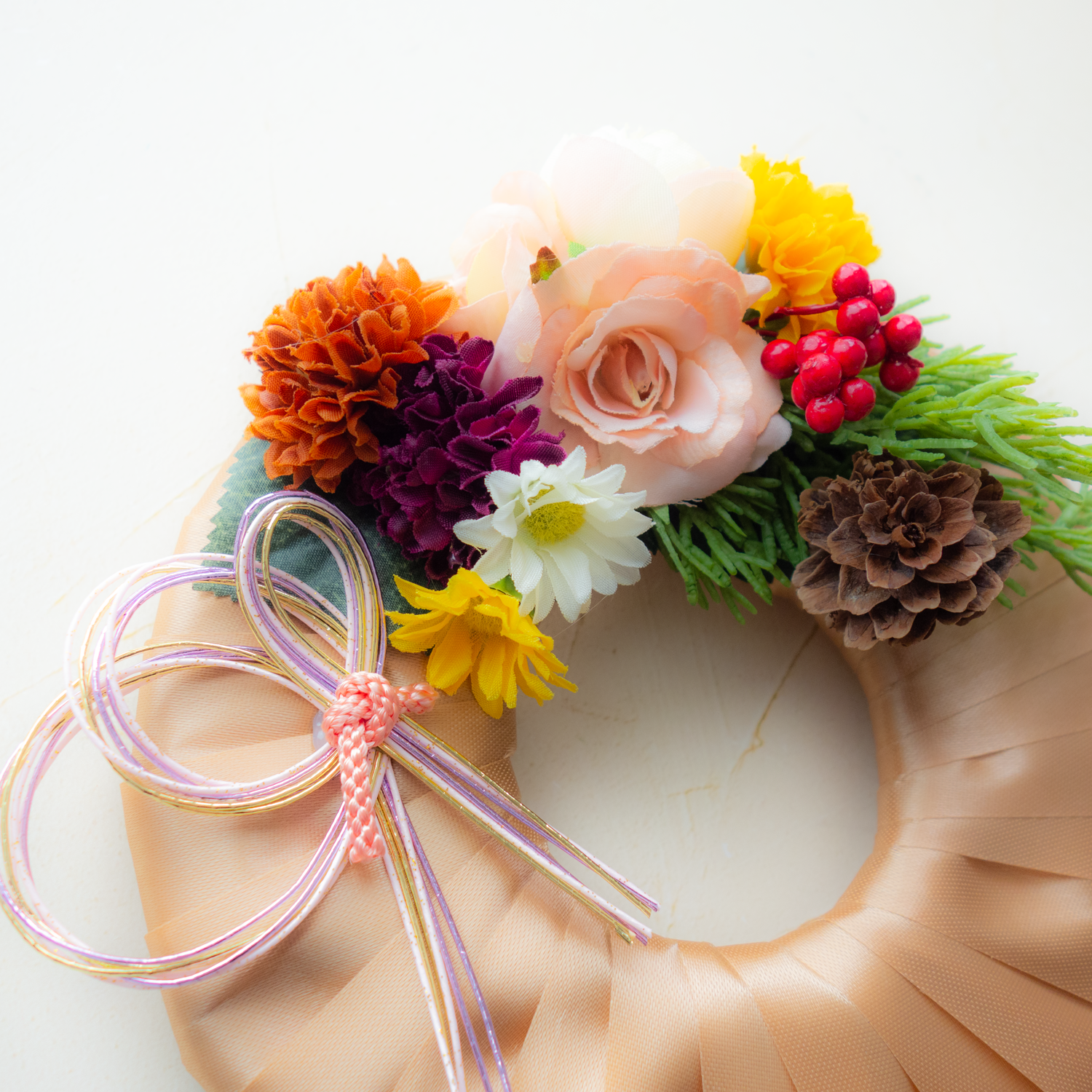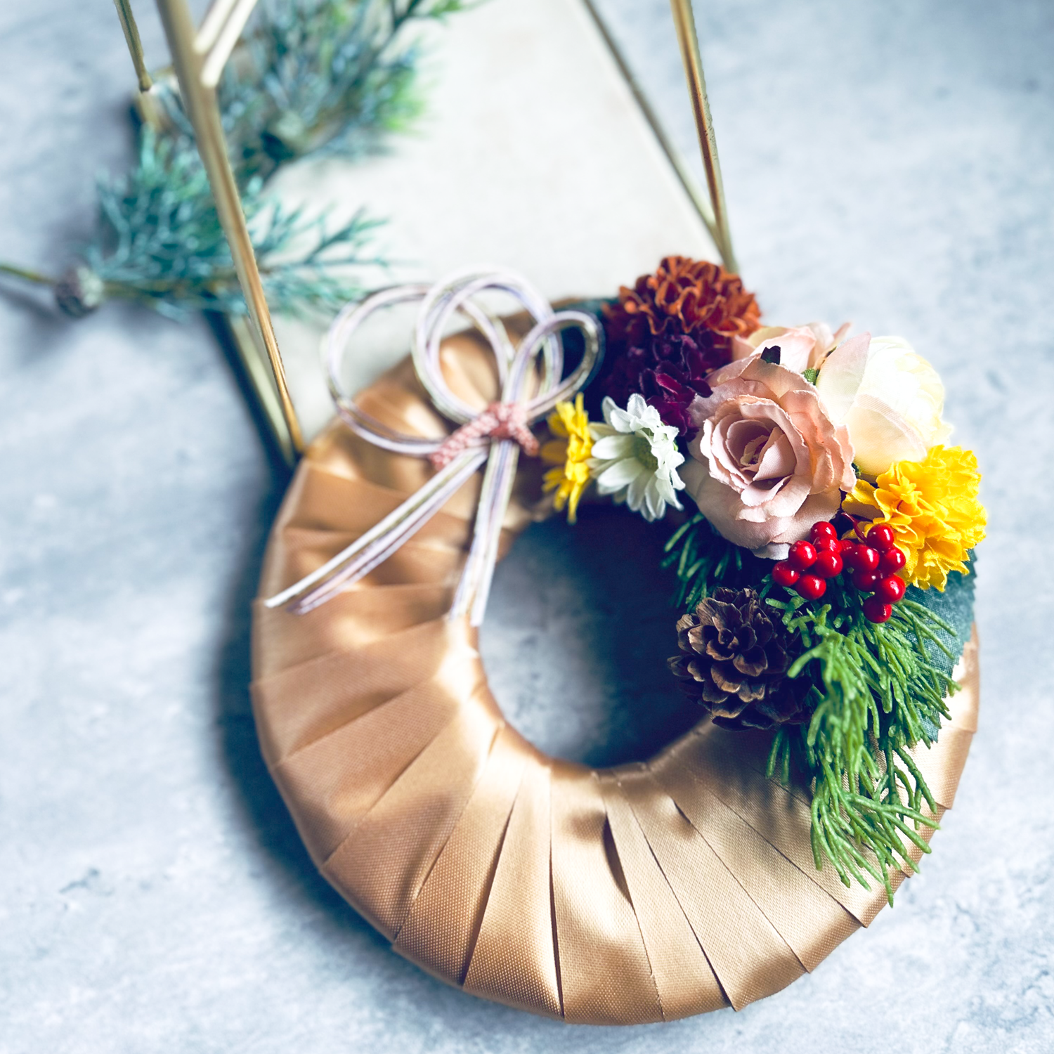 檜葉や柊(アートフラワー)、木の実などに水引を小さくアレンジして